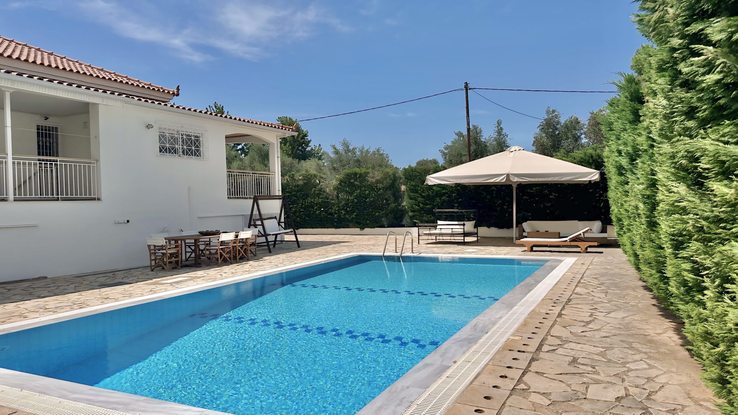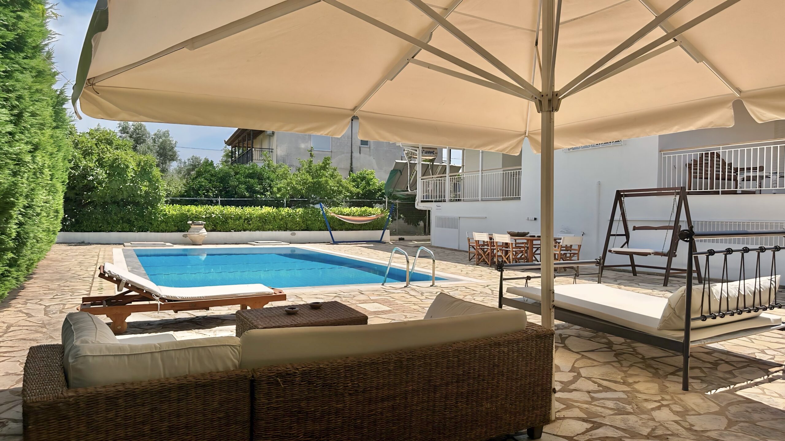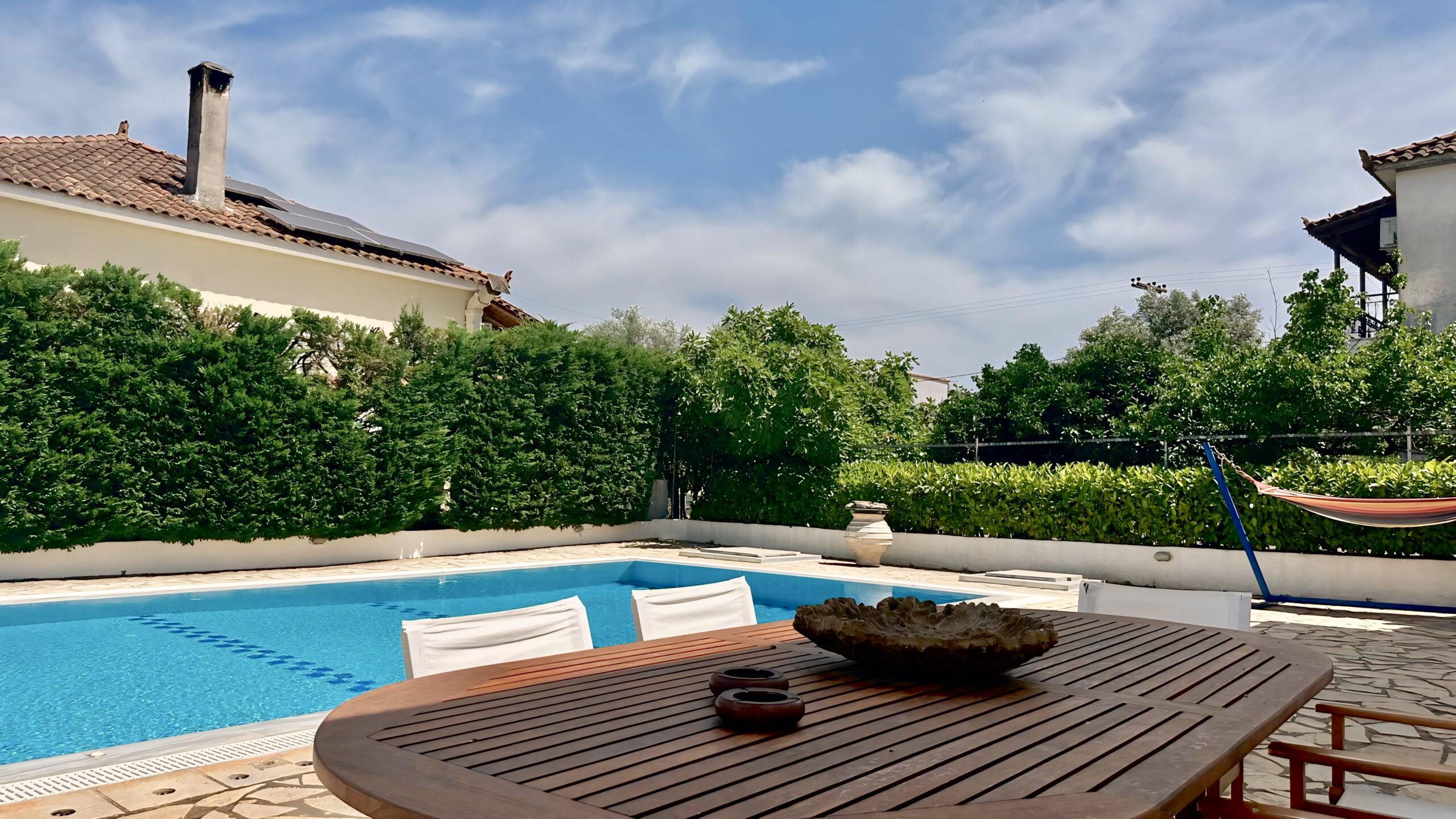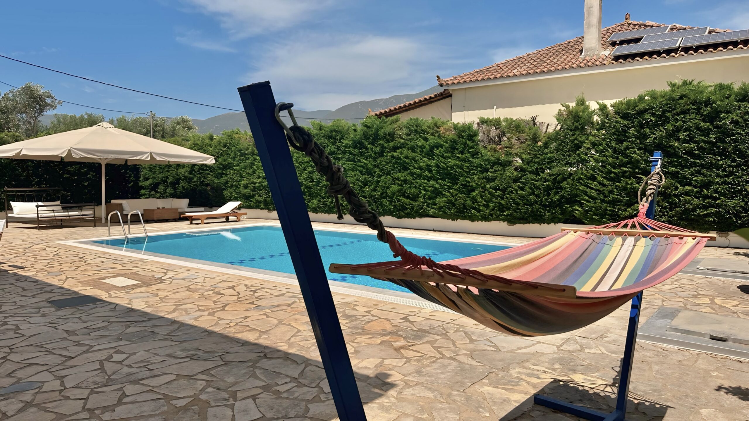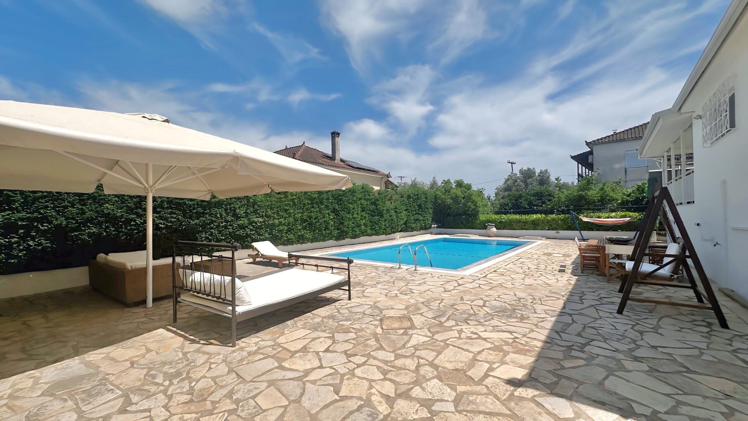 Η εξωτερική περιοχή της βίλας είναι εξίσου εντυπωσιακή, με μια μεγάλη πισίνα που σας προσκαλεί να απολαύσετε δροσερές βουτιές κάτω από τον καυτό ελληνικό ήλιο. Η βεράντα με θέα στη γύρω εξοχή είναι το ιδανικό μέρος για να χαλαρώσετε με ένα ποτό το βράδυ, απολαμβάνοντας την ηρεμία και τη φυσική ομορφιά της περιοχής.