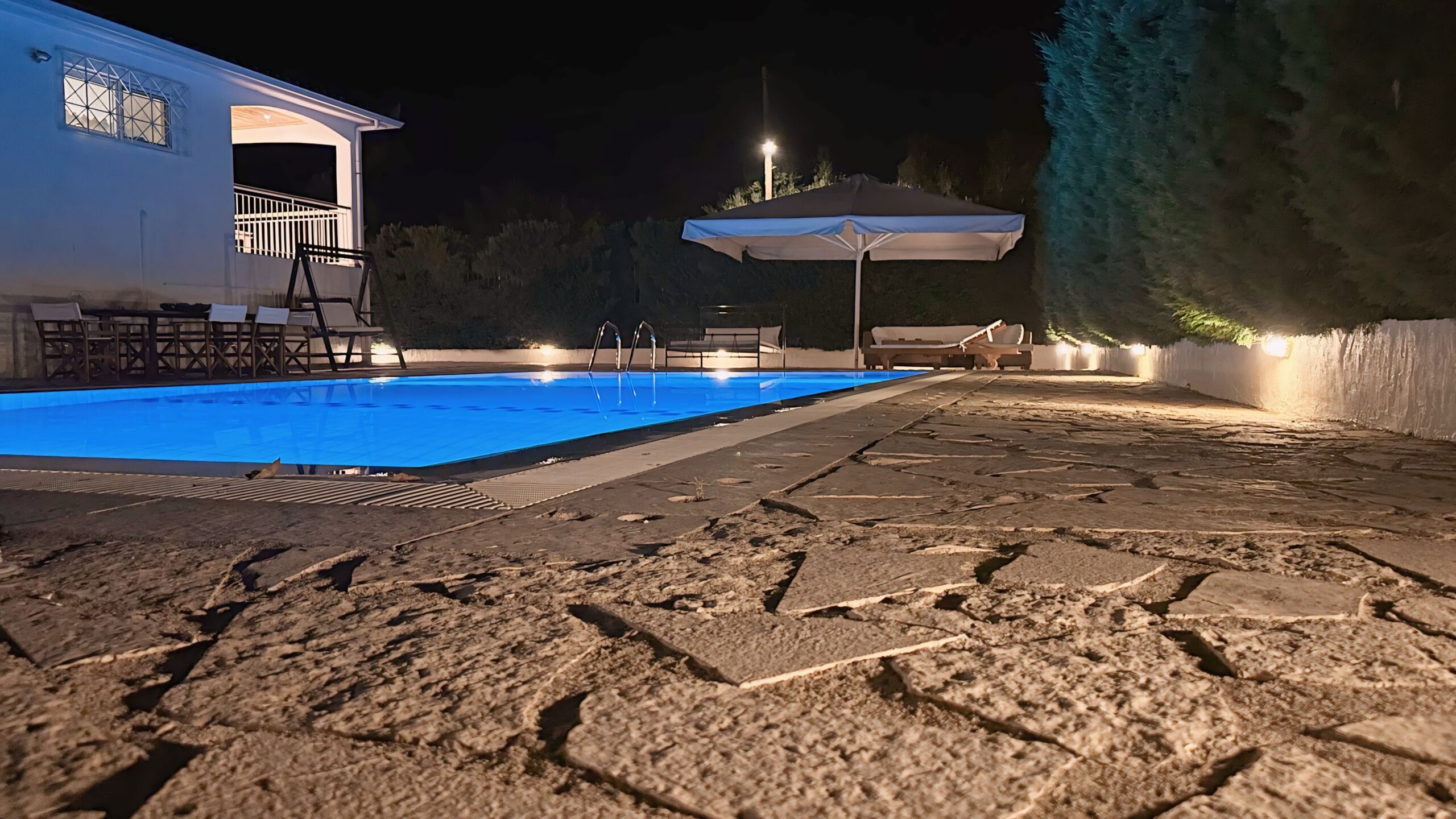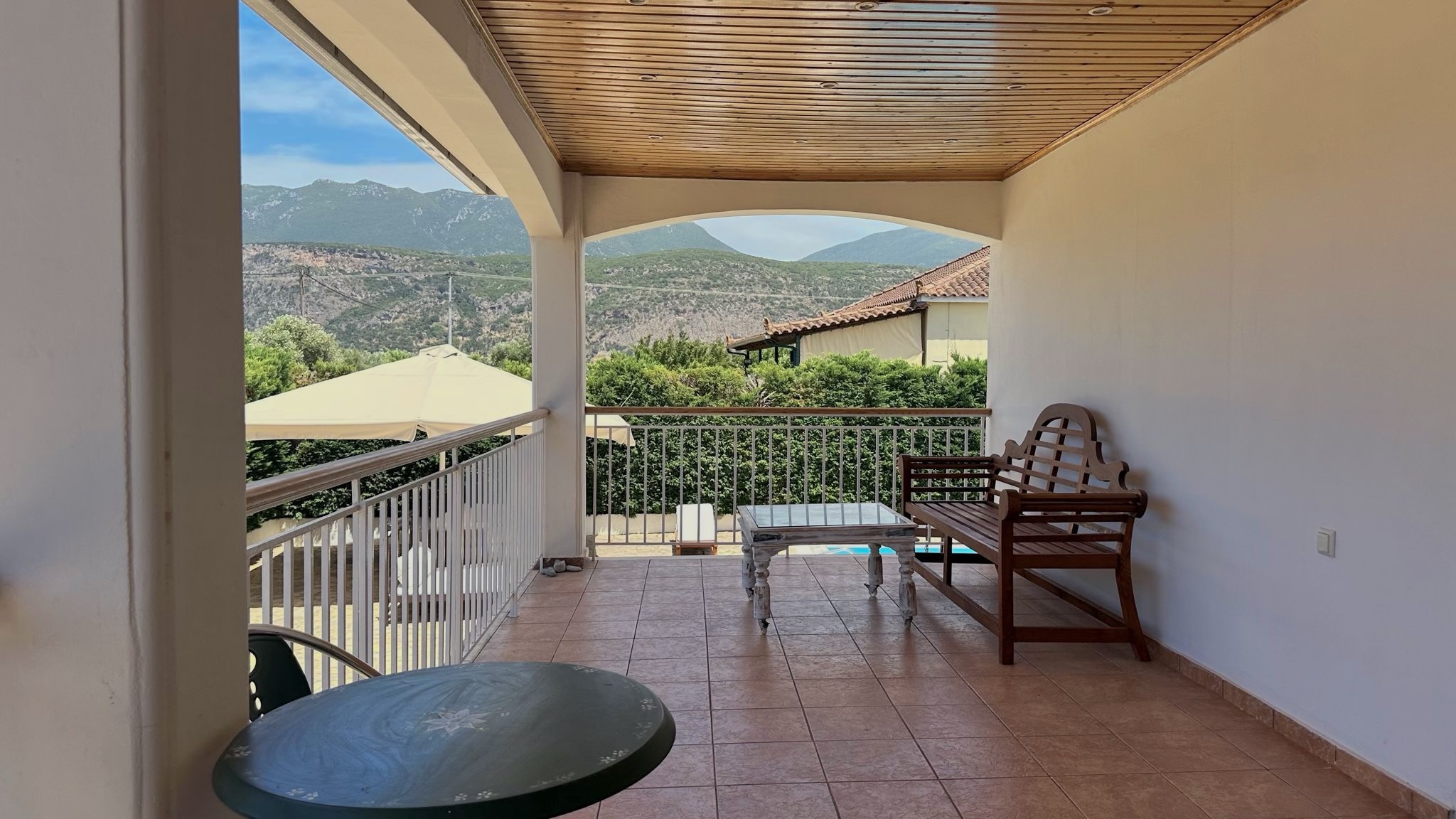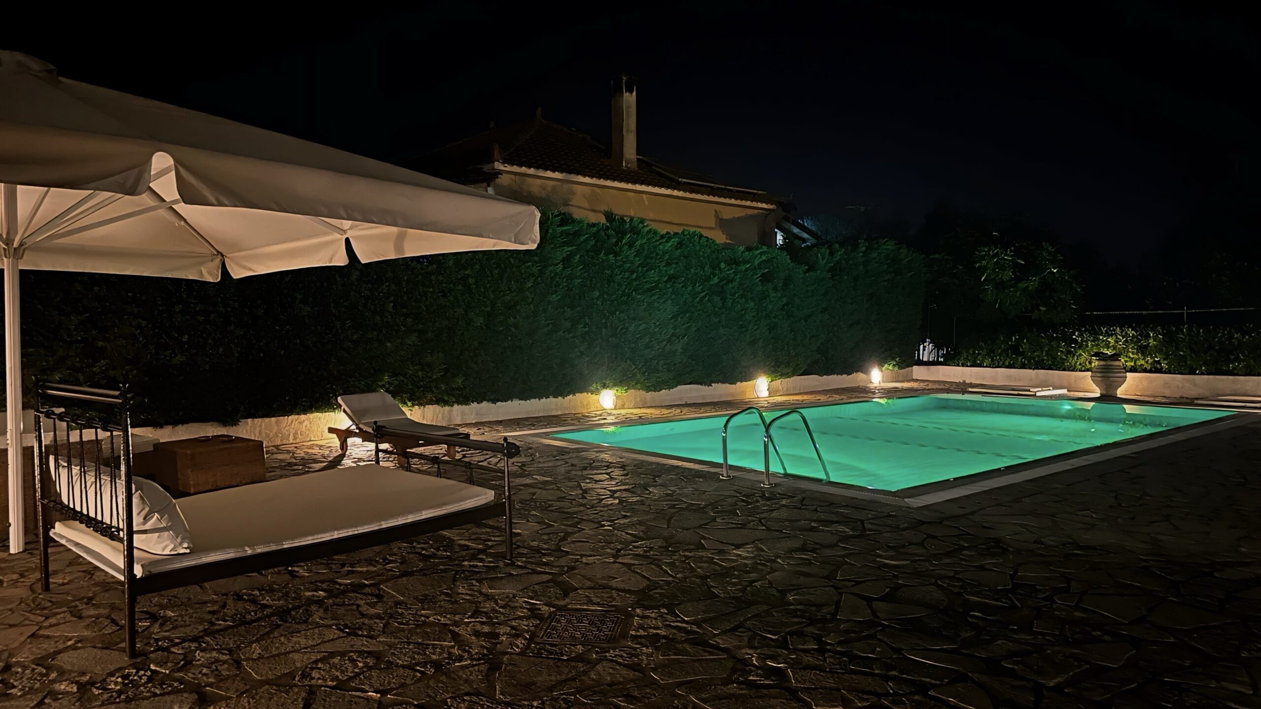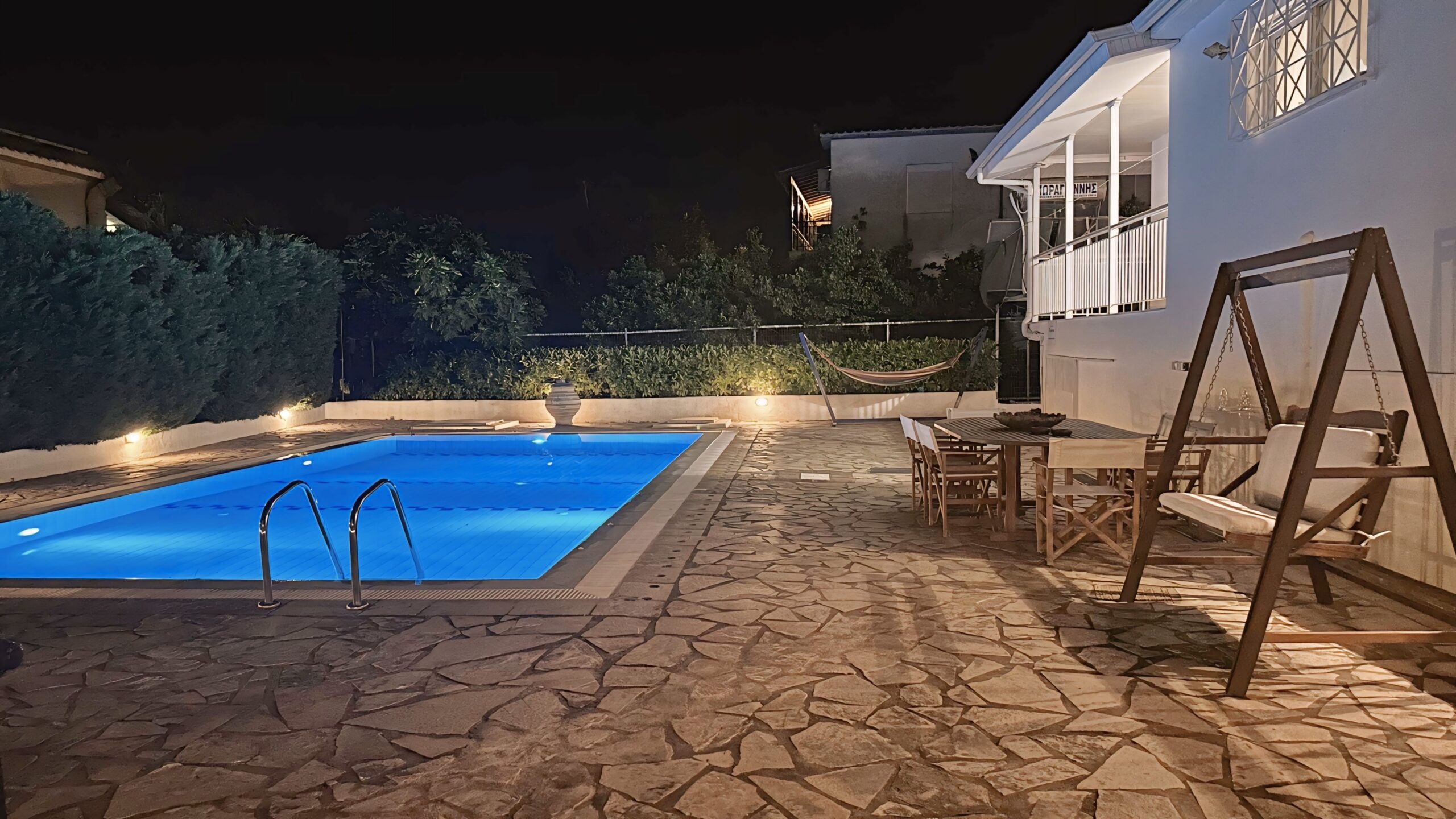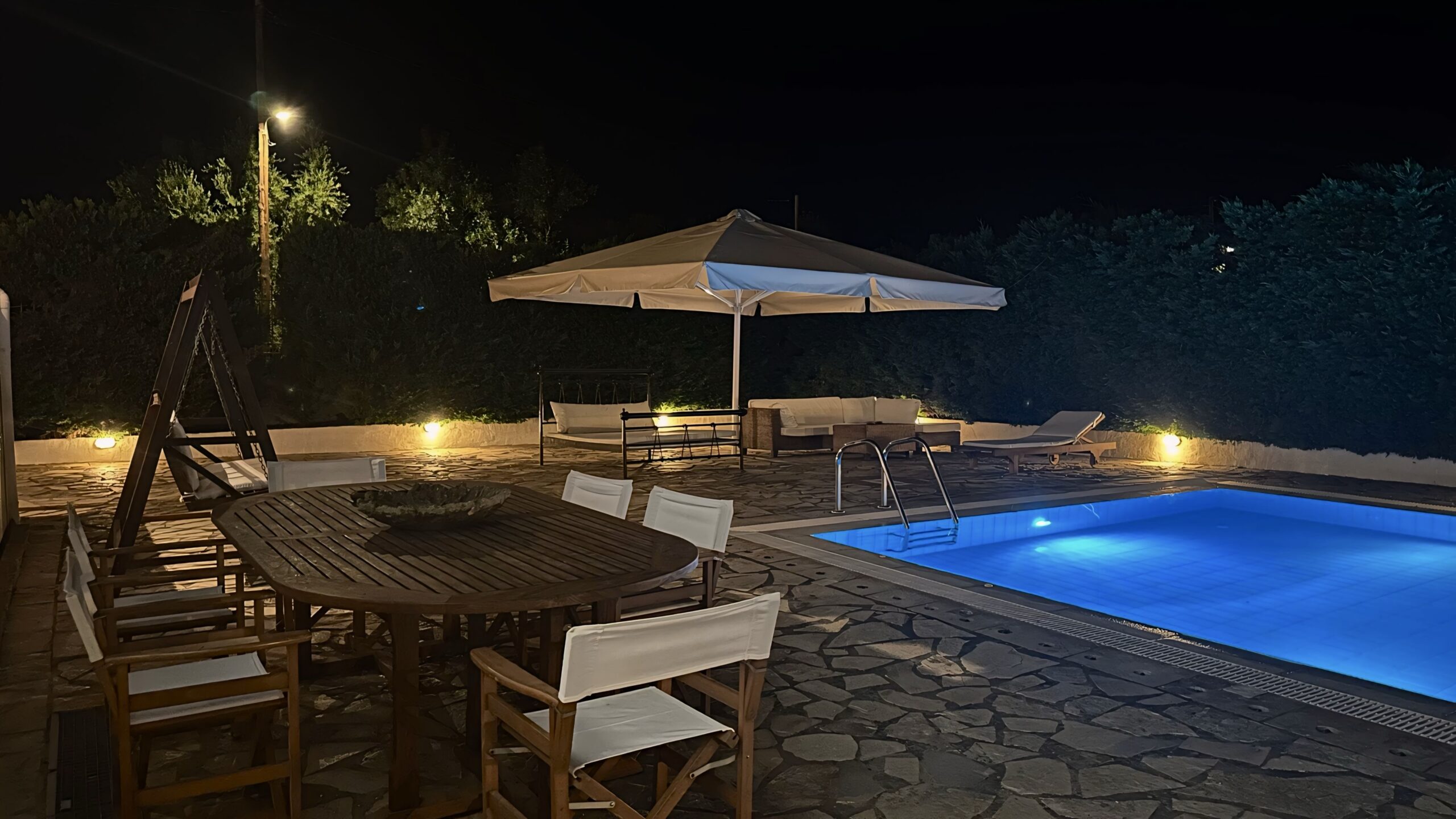 Η εξωτερική περιοχή της βίλας είναι εξίσου εντυπωσιακή, με μια μεγάλη πισίνα που σας προσκαλεί να απολαύσετε δροσερές βουτιές κάτω από τον καυτό ελληνικό ήλιο. Η βεράντα με θέα στη γύρω εξοχή είναι το ιδανικό μέρος για να χαλαρώσετε με ένα ποτό το βράδυ, απολαμβάνοντας την ηρεμία και τη φυσική ομορφιά της περιοχής.